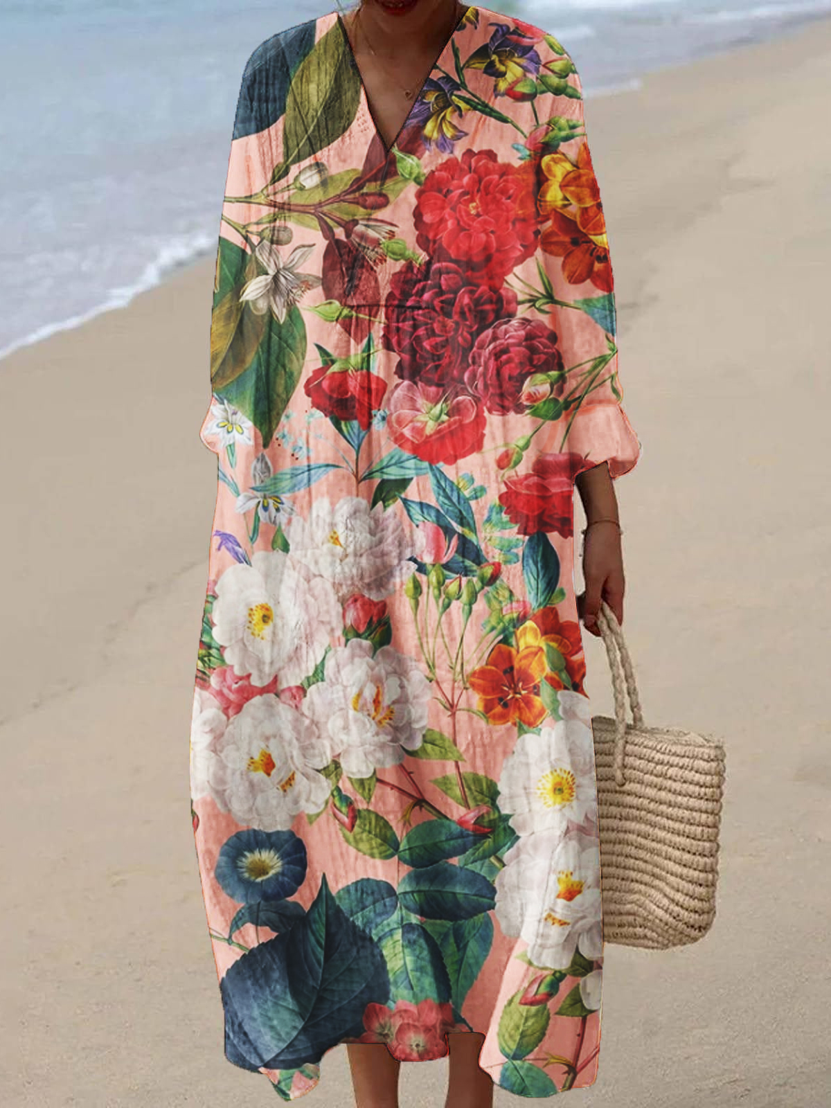 Printed V-Neck Elegant Chic Loose Long Sleeve Maxi Dress