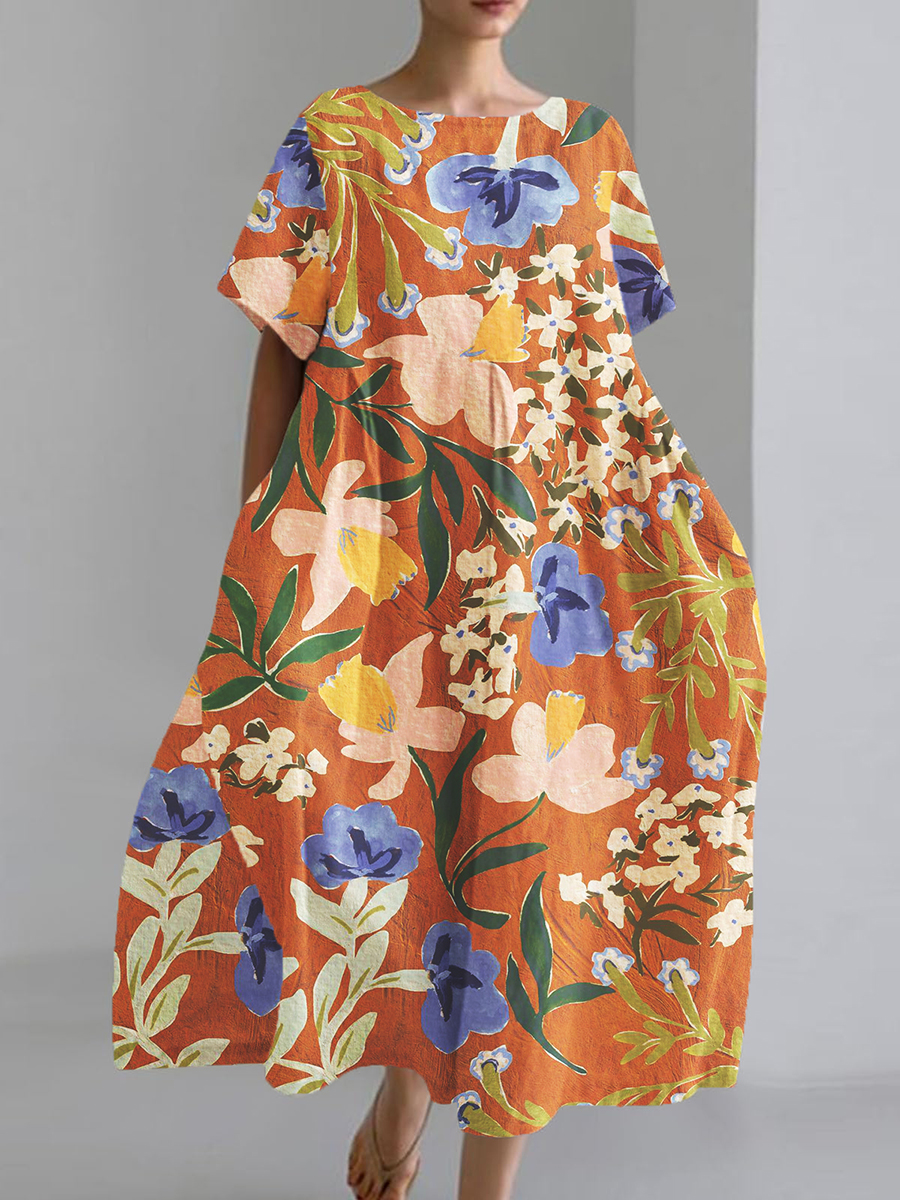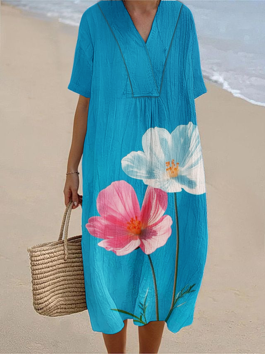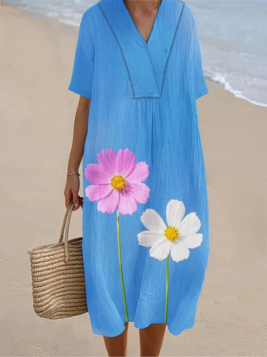 Women's Seaside Holiday Style Floral Print Short Sleeve Cotton and Linen Dress