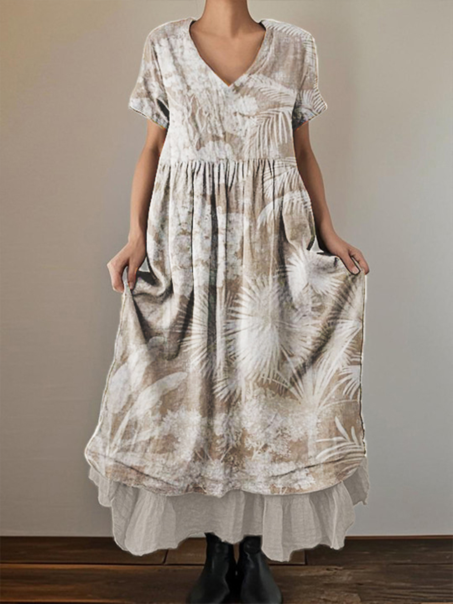 Women's Retro Printed Cotton and Linen Double Layer Short Sleeve Dress