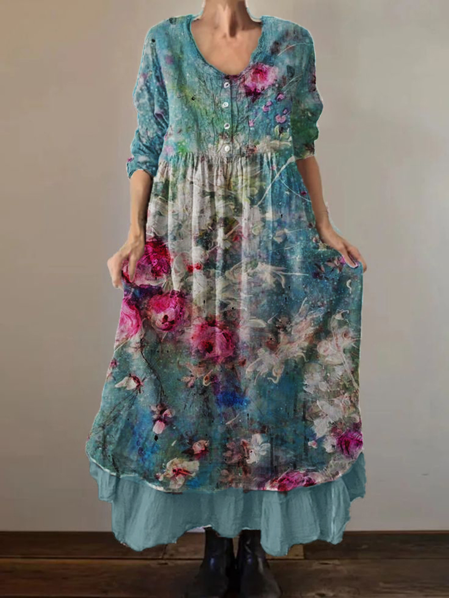 Women's Oil Painting 3D Printed 3/4 Sleeve Cotton and Linen Double-Layer Dress