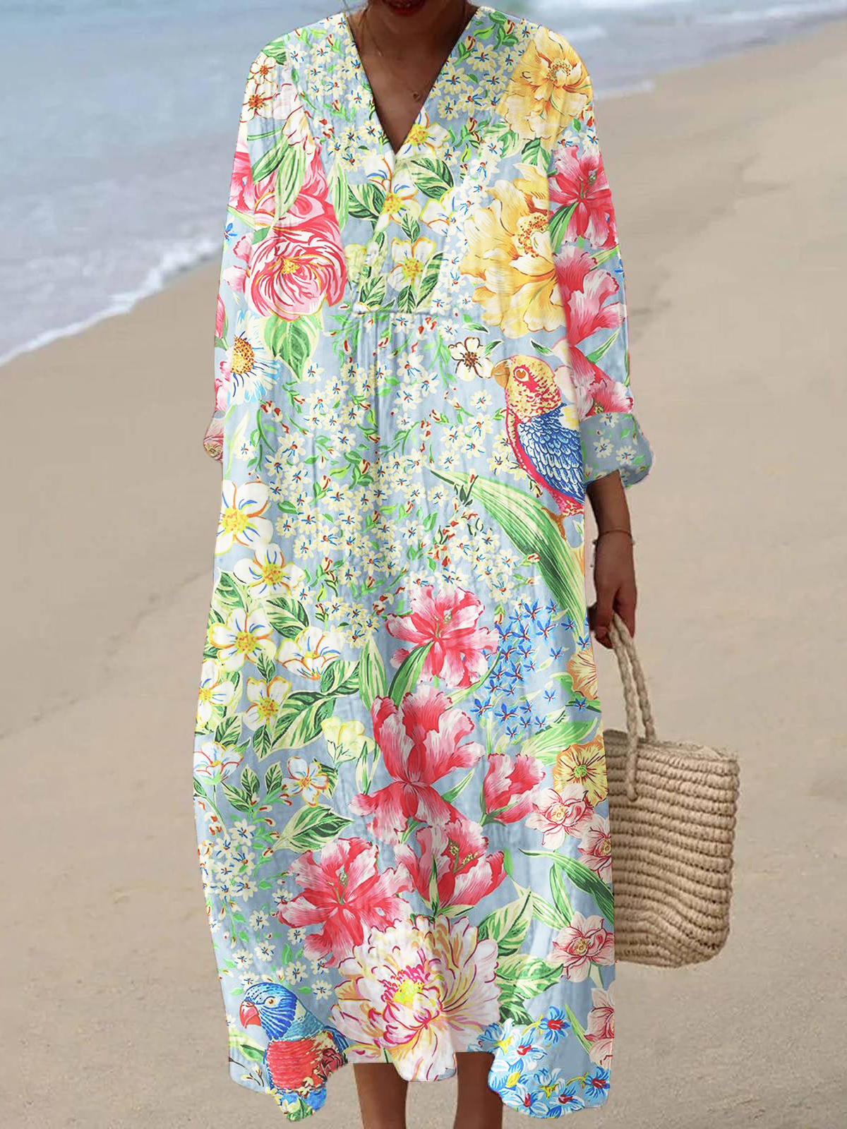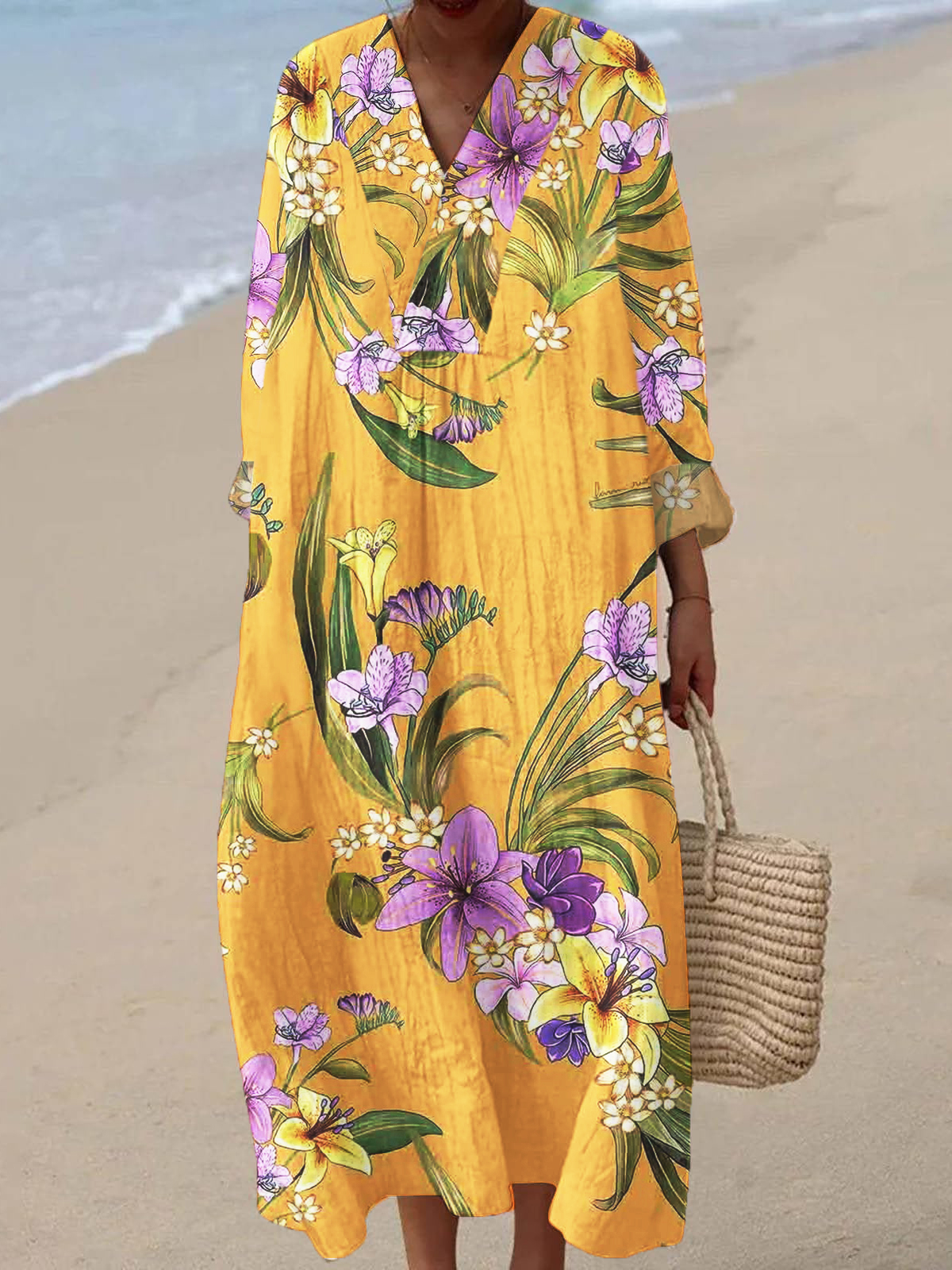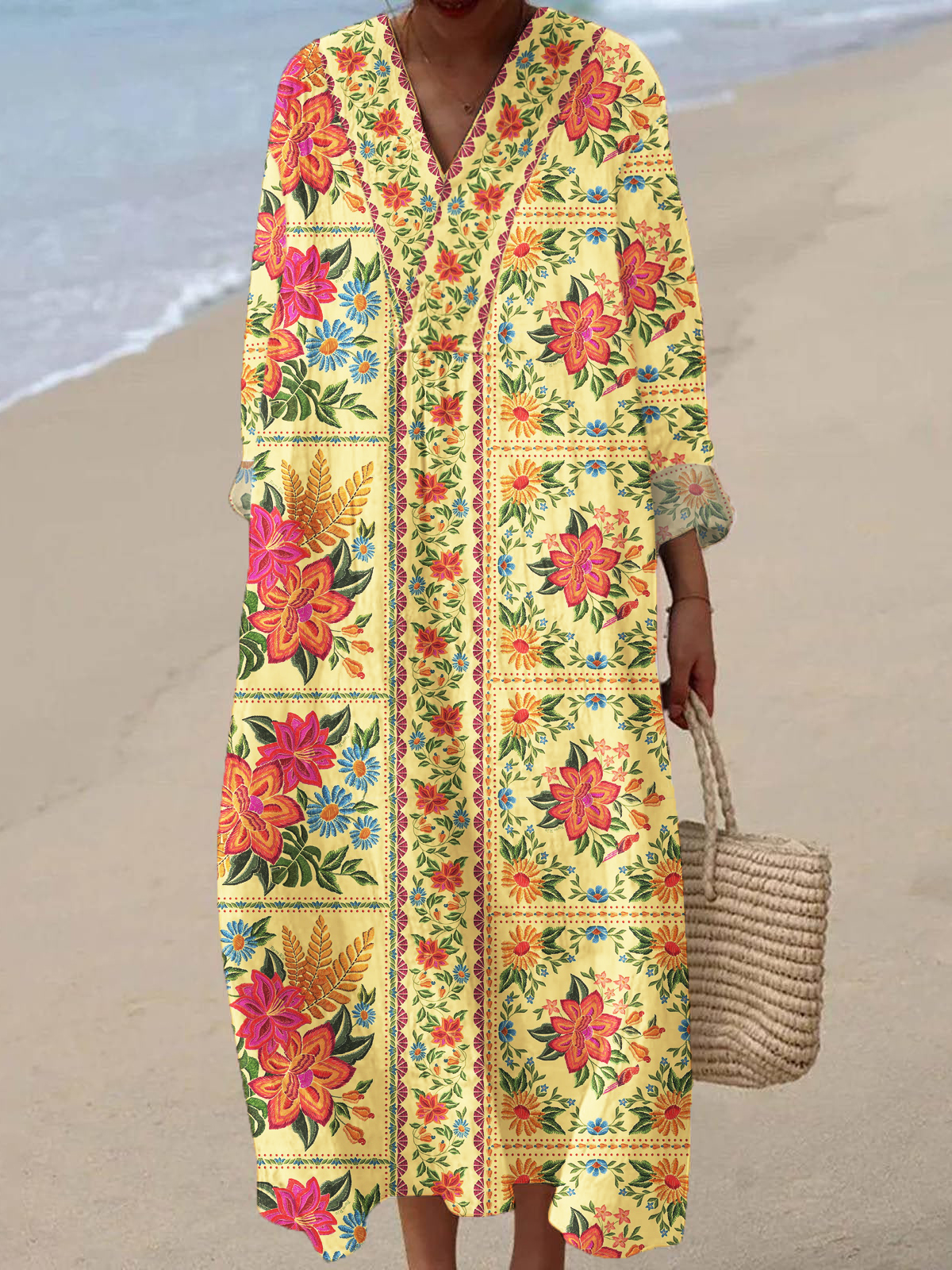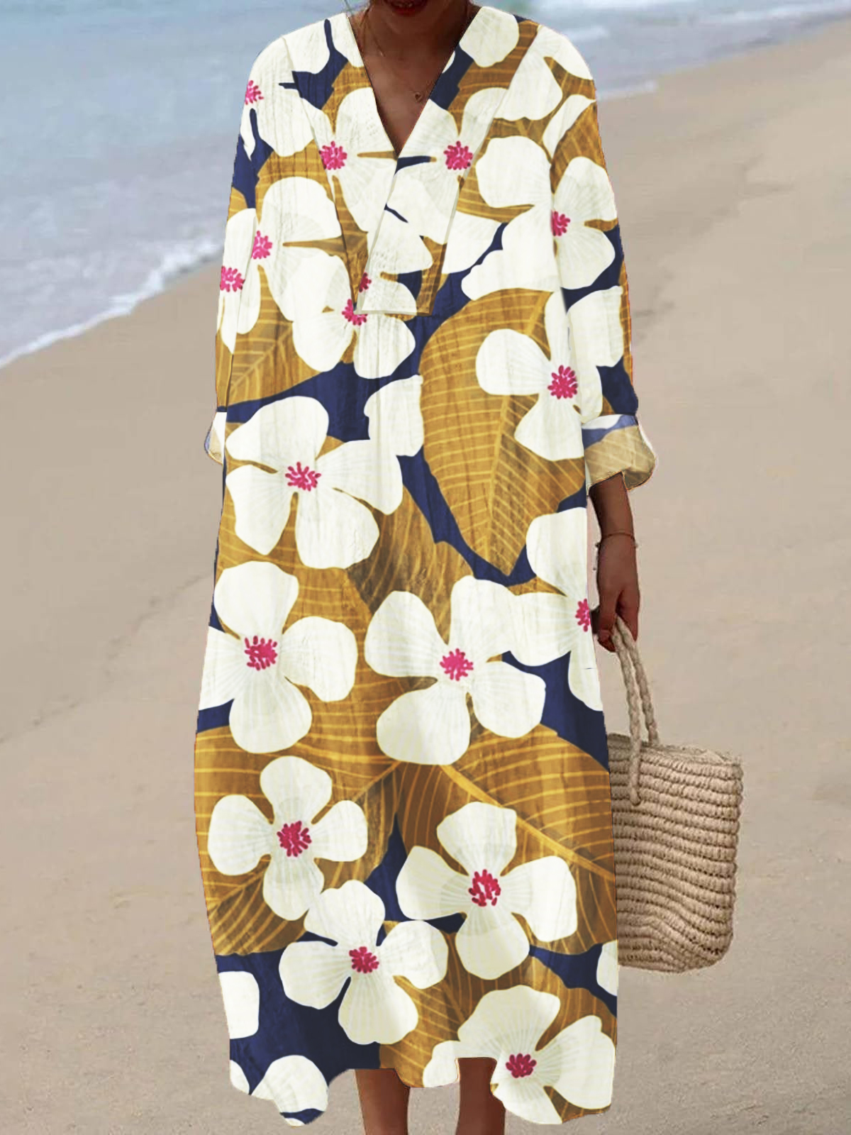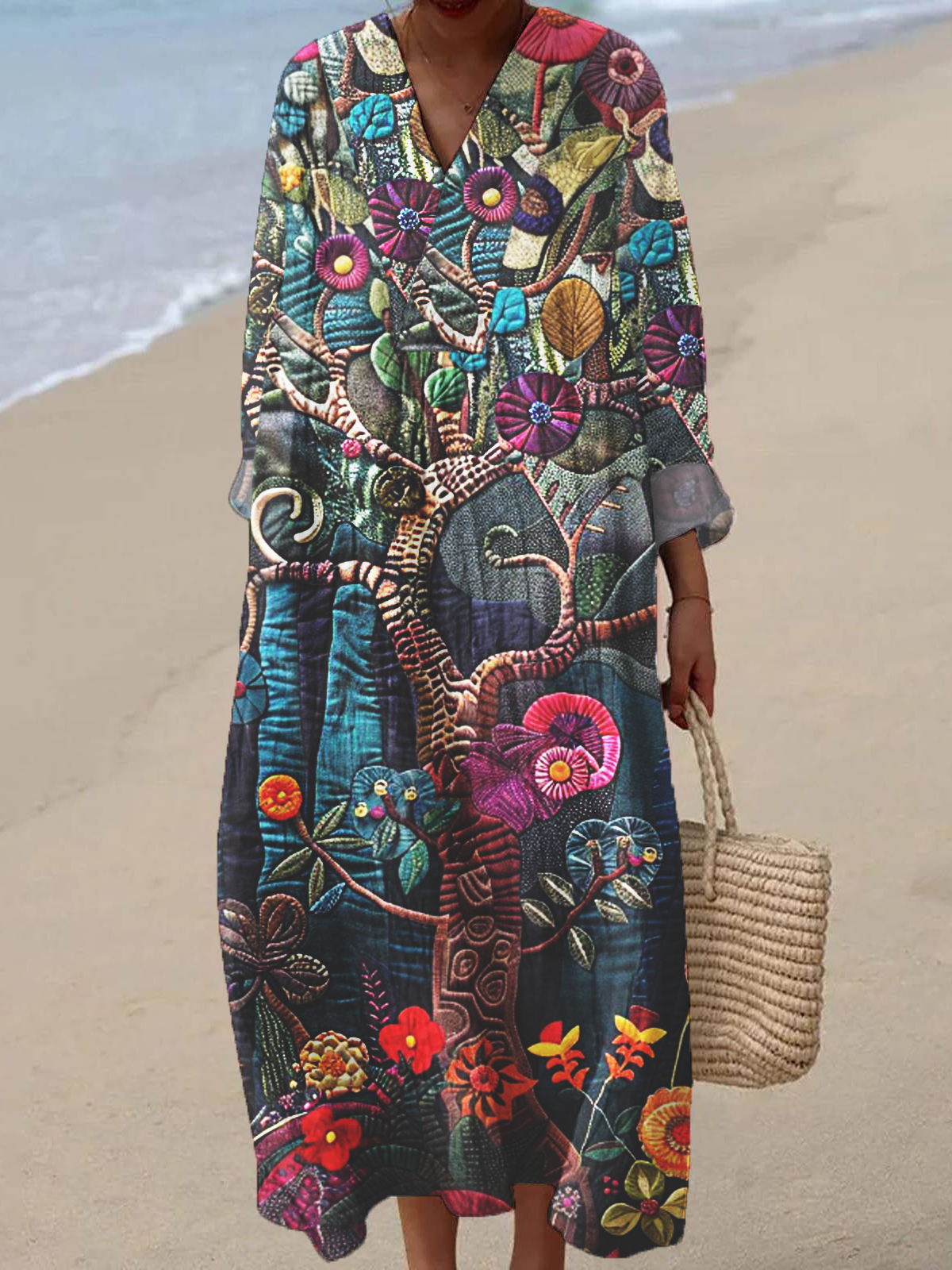 Women's V-neck Original Art Print 3/4 Sleeve Cotton and Linen Dress