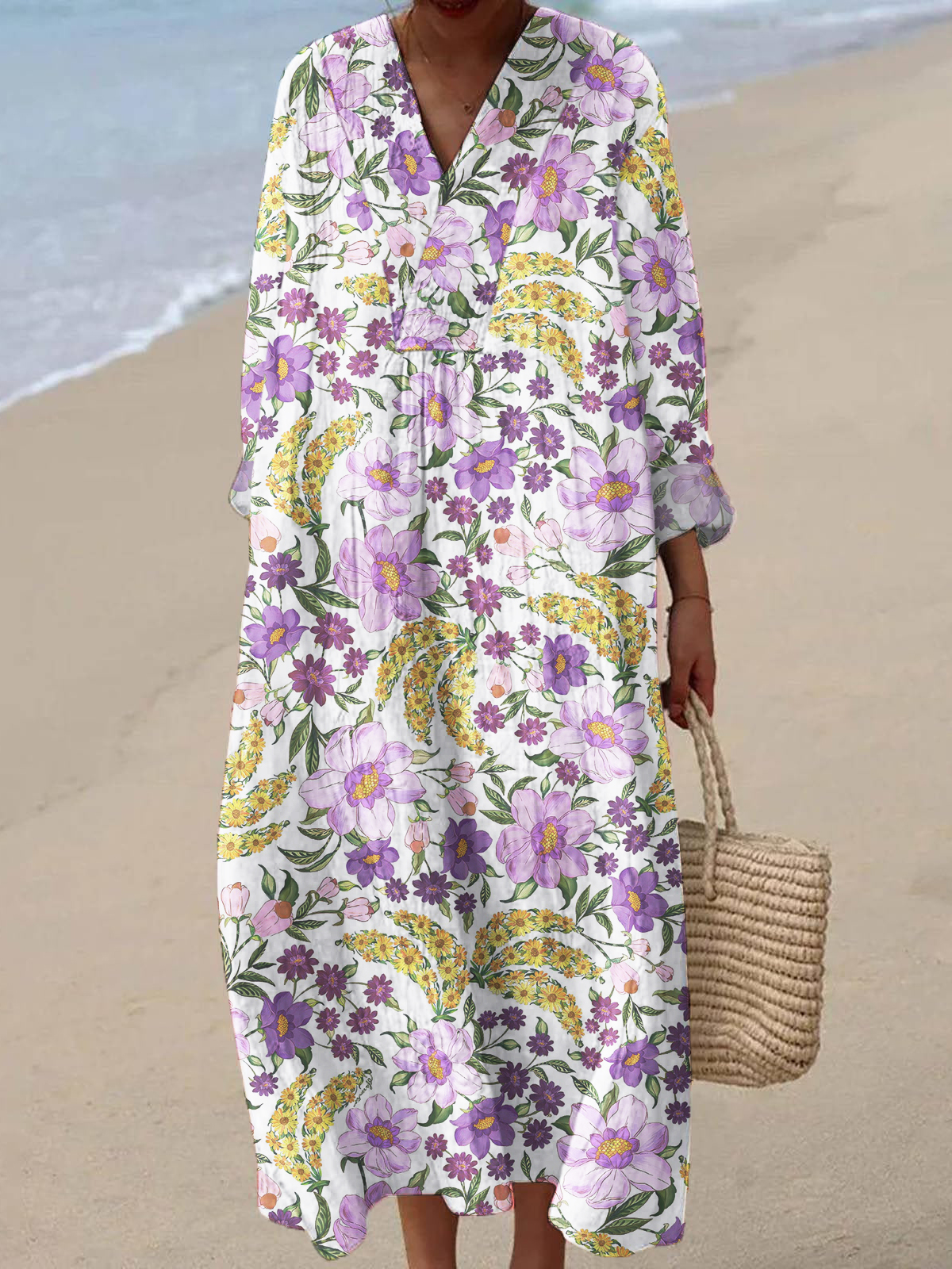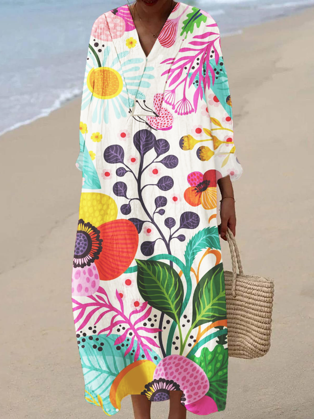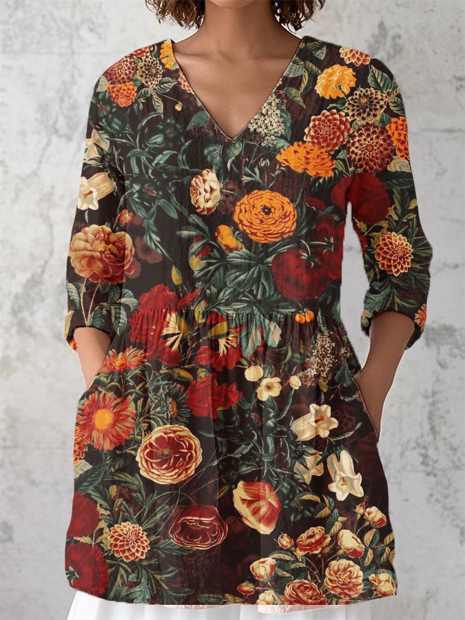 Women's Colorful Floral Art 3D Printed V-Neck 3/4 Sleeve Cotton and Linen Dress