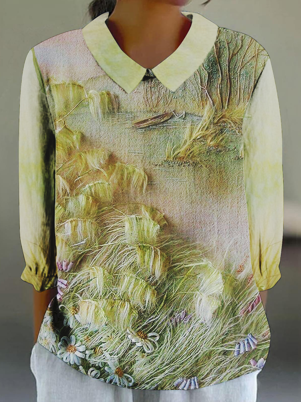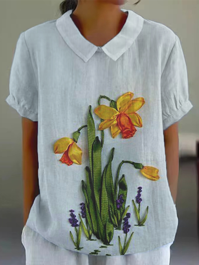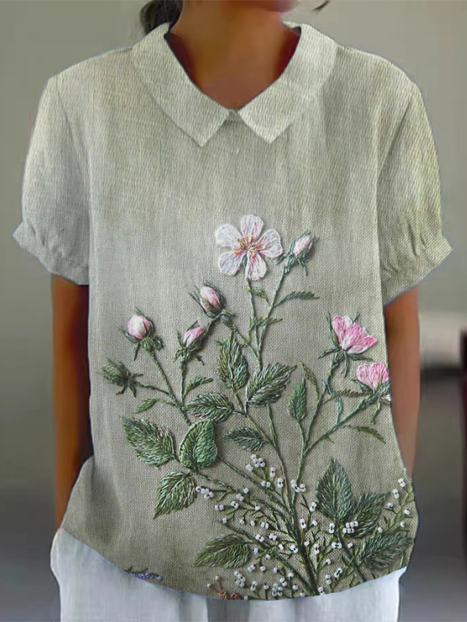 Women's 3D Floral Print 3/4 Sleeve Cotton and Linen Shirt
