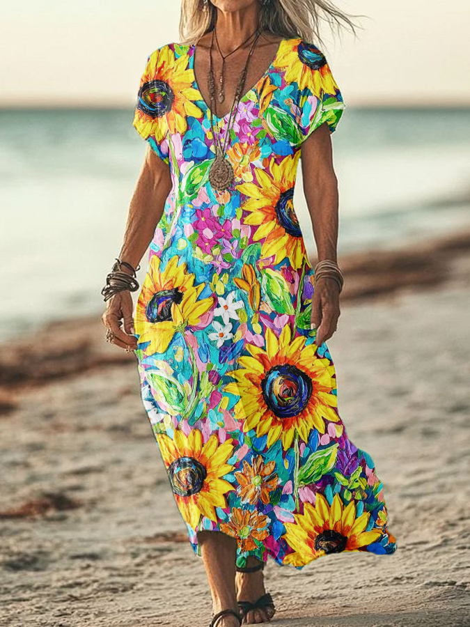 Women's Summer Seaside Vacation Style V-Neck Oil Painting Art Print Short Sleeve Cotton Dresses