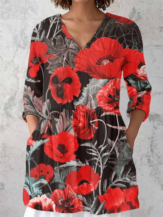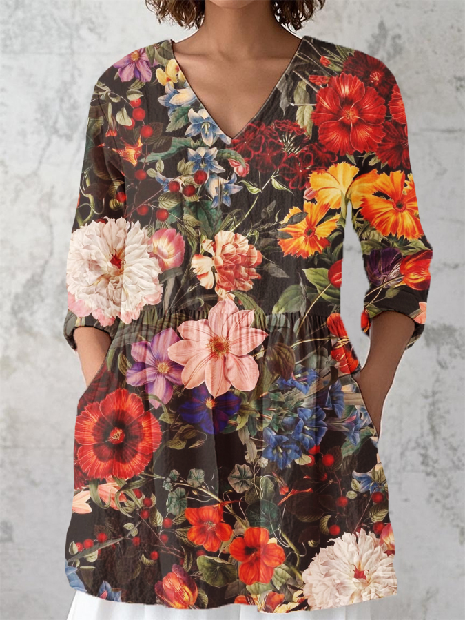 Women's Vintage Floral Print V-Neck 3/4 Sleeve Cotton and Linen Shirt