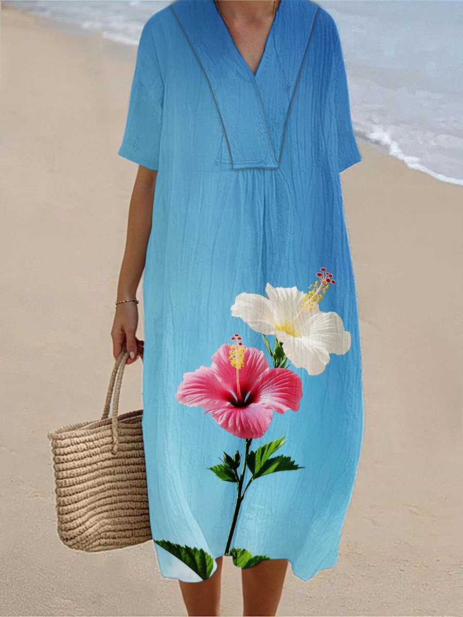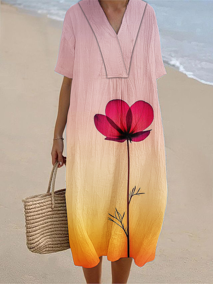 Women's Summer Seaside Vacation Style V-Neck Gradient Printed Short Sleeve Cotton Linen Dresses