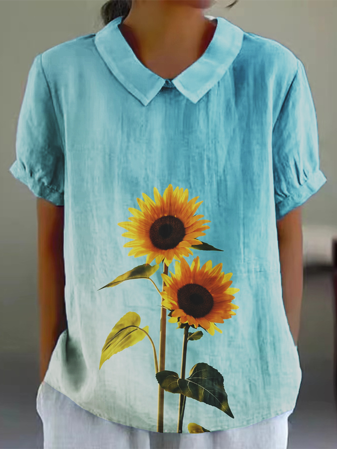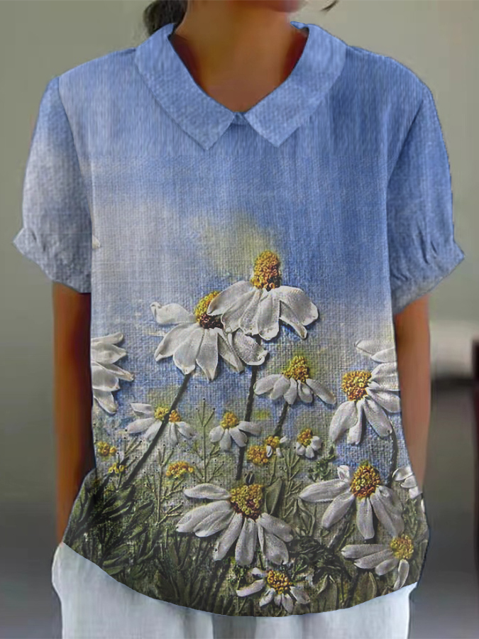 Women's Colorful Watercolor Floral Print Cotton and Linen Short Sleeve Shirt