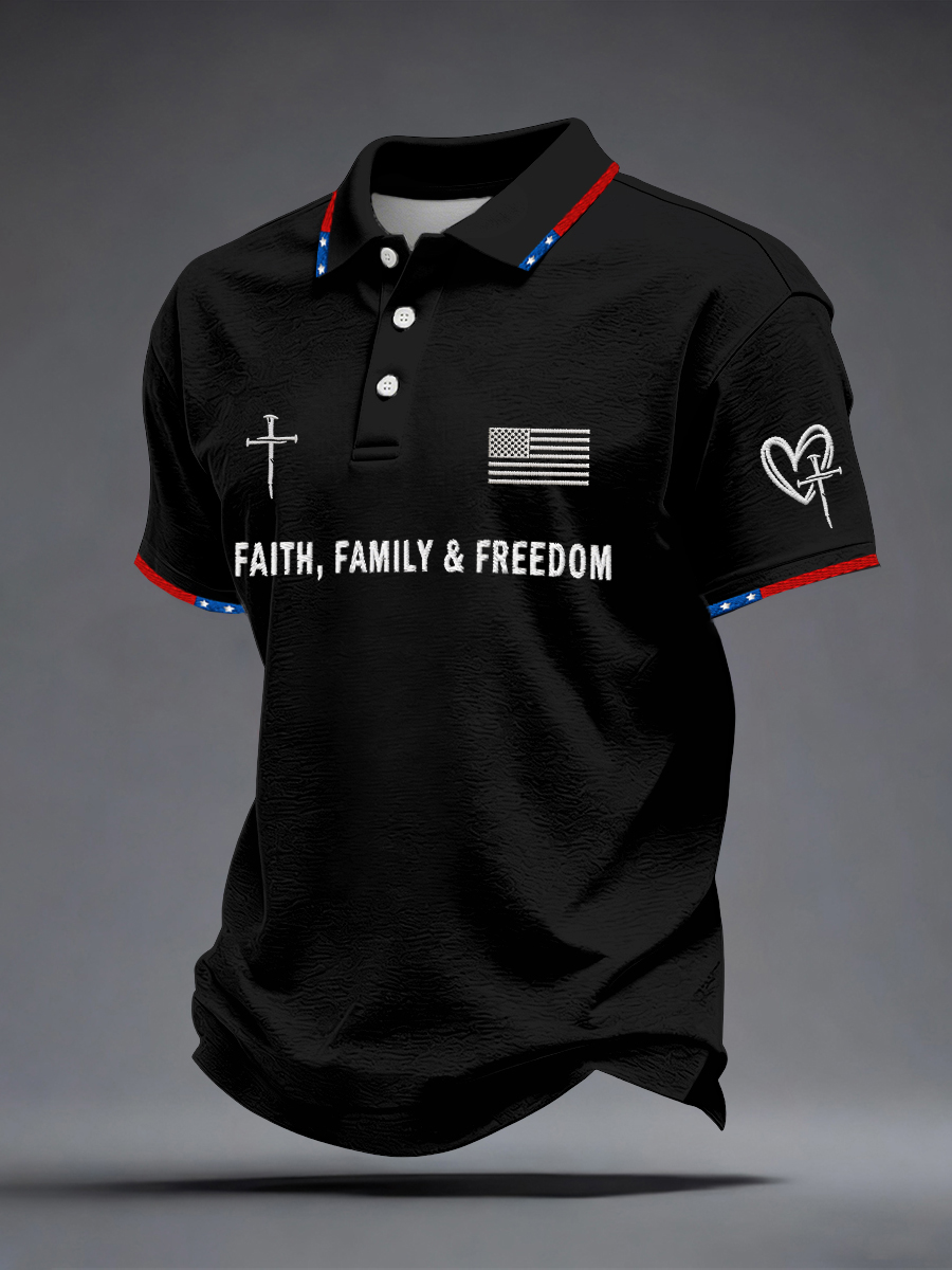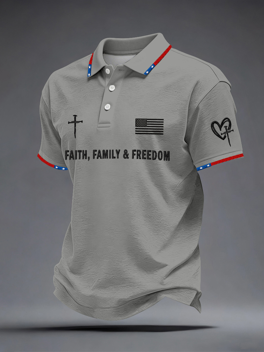 Men's Faith Family Freedom Embroidery Pattern Polo Shirt