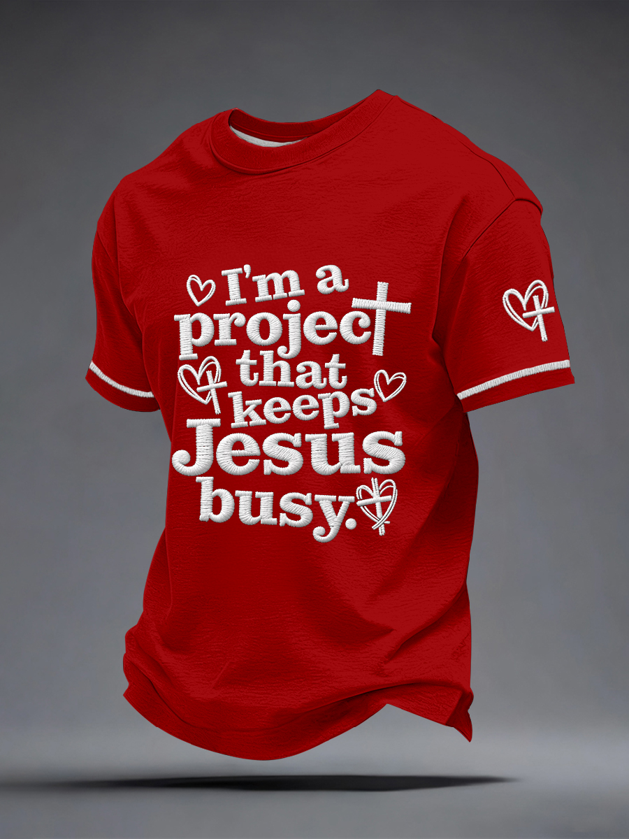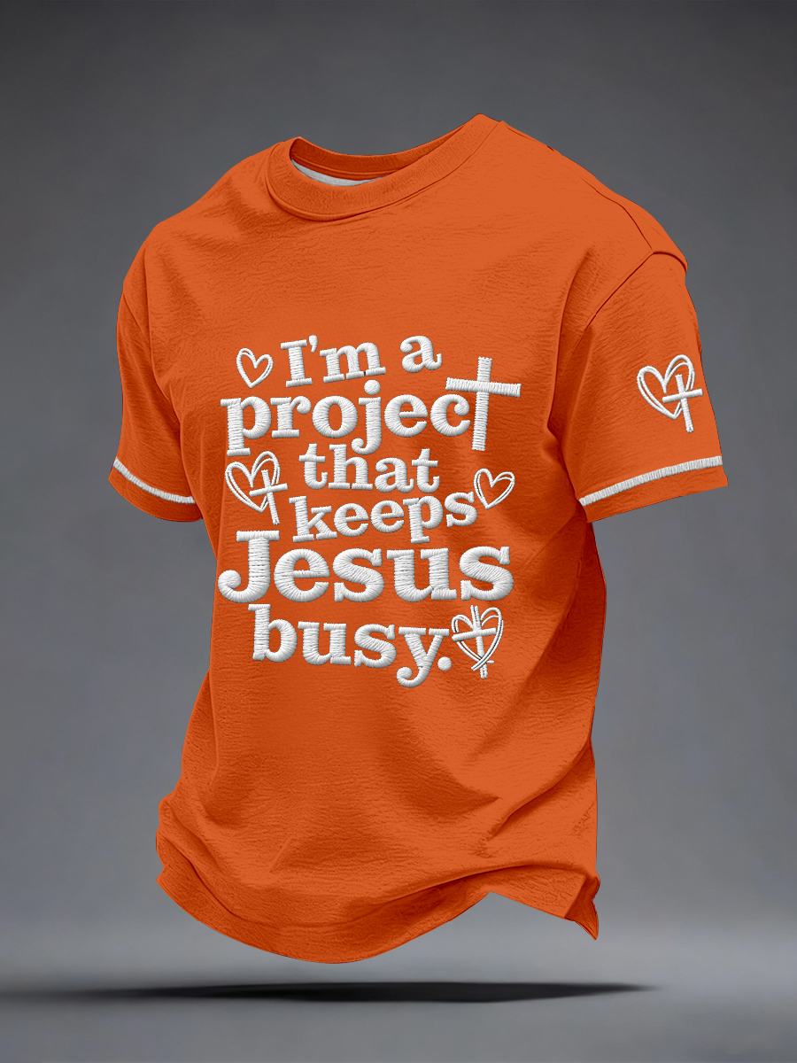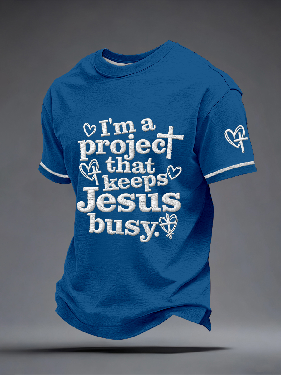 Men's I'm a Project That Keeps Jesus Busy Embroidery Pattern T-Shirt