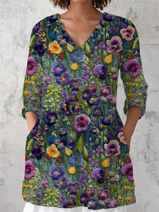 Women's Alzheimer's Awareness Purple Flower Printed V-Neck Cotton Linen Long Sleeve Shirt