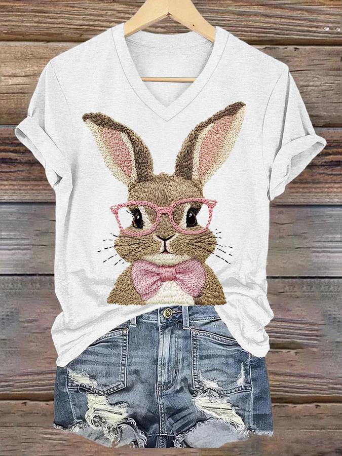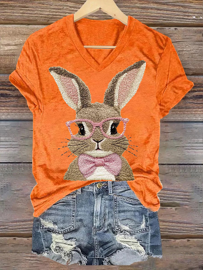 Women's Cute Bunny Happy Easter Casual V-Neck Tee