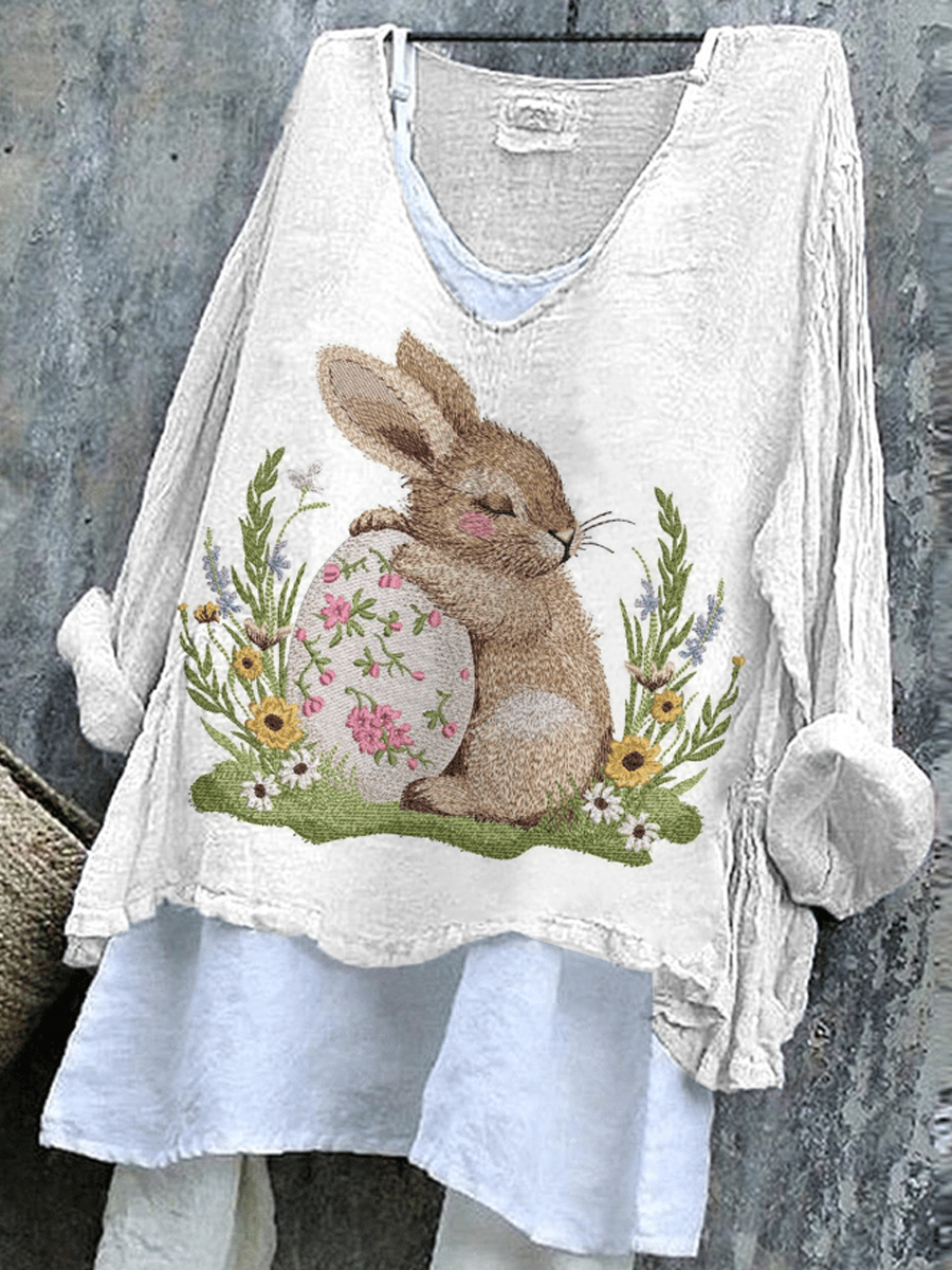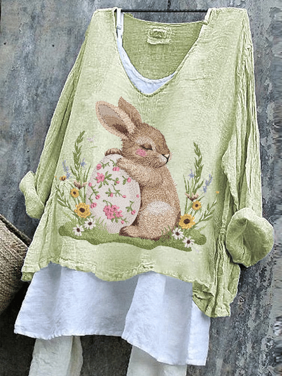 Women's Cute Rabbit Pattern Printed V-Neck Cotton Linen Comfortable Long Sleeve Shirt