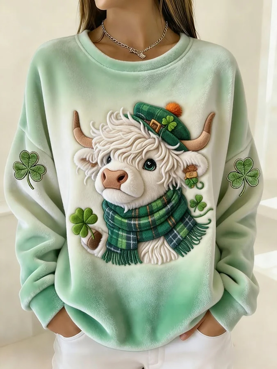 Women's Cute Shamrocks Highland Cow Print Flannel Sweatshirt