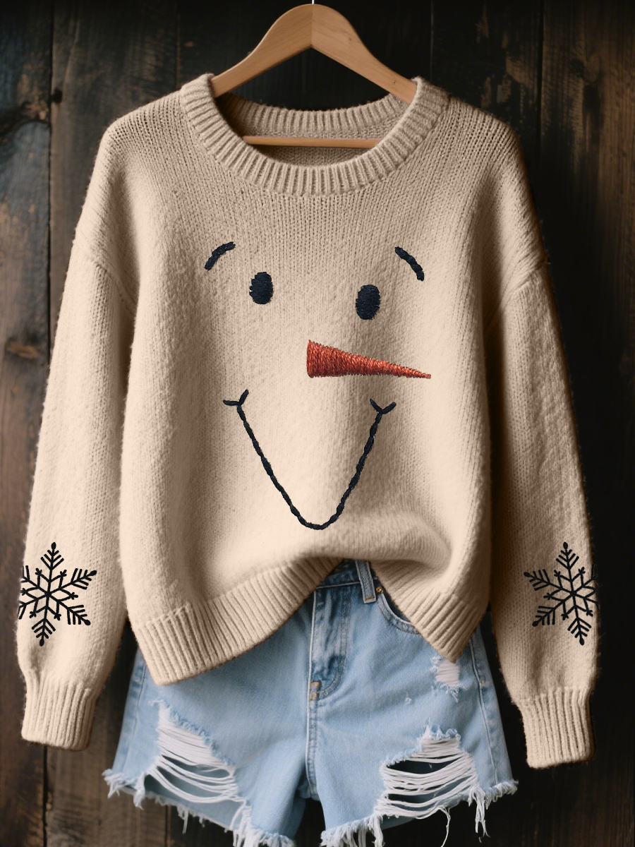 Women's Cute Snowman Embroidered Cozy Knit Sweater