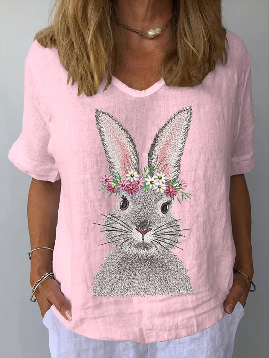 Women's Easter Bunny Print Casual V-Neck Cotton and Linen Top