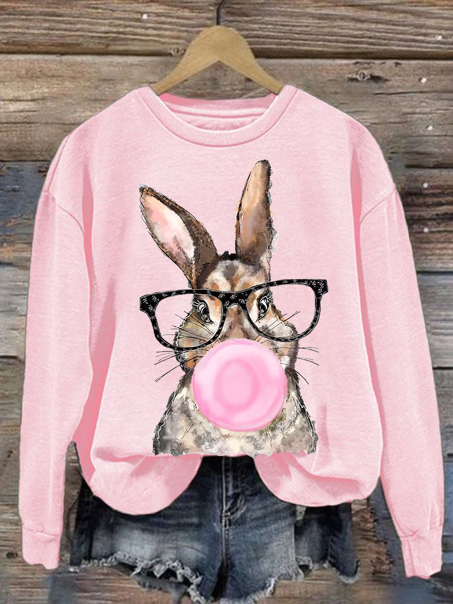 Women's Easter Bunny with Leopard Glasses Printed O-Neck Casual Loose Long Sleeve Sweatshirt