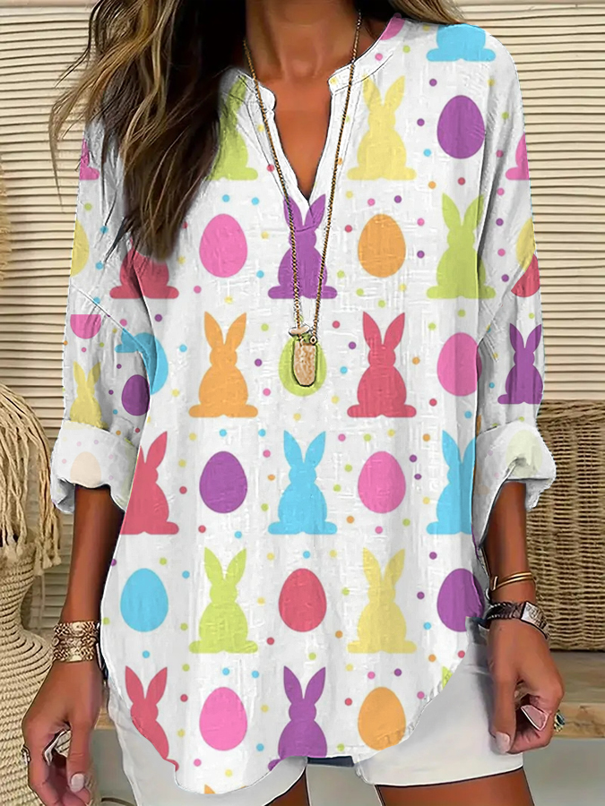 Women's Easter Colorful Bunny and Eggs Printed Casual Long Sleeve Shirt