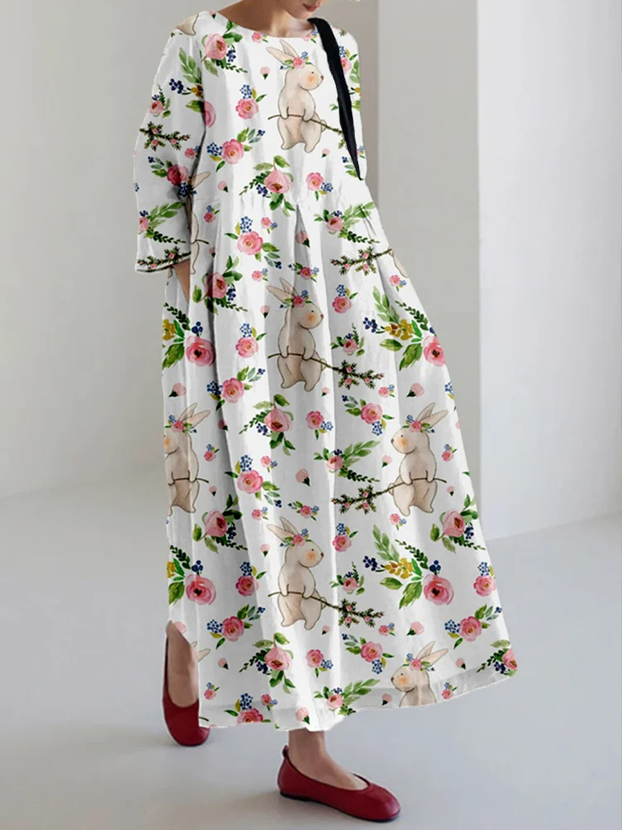 Women's Eatser Cute Bunnies & Flowers Printed Cotton Linen O-Neck Maxi Dress