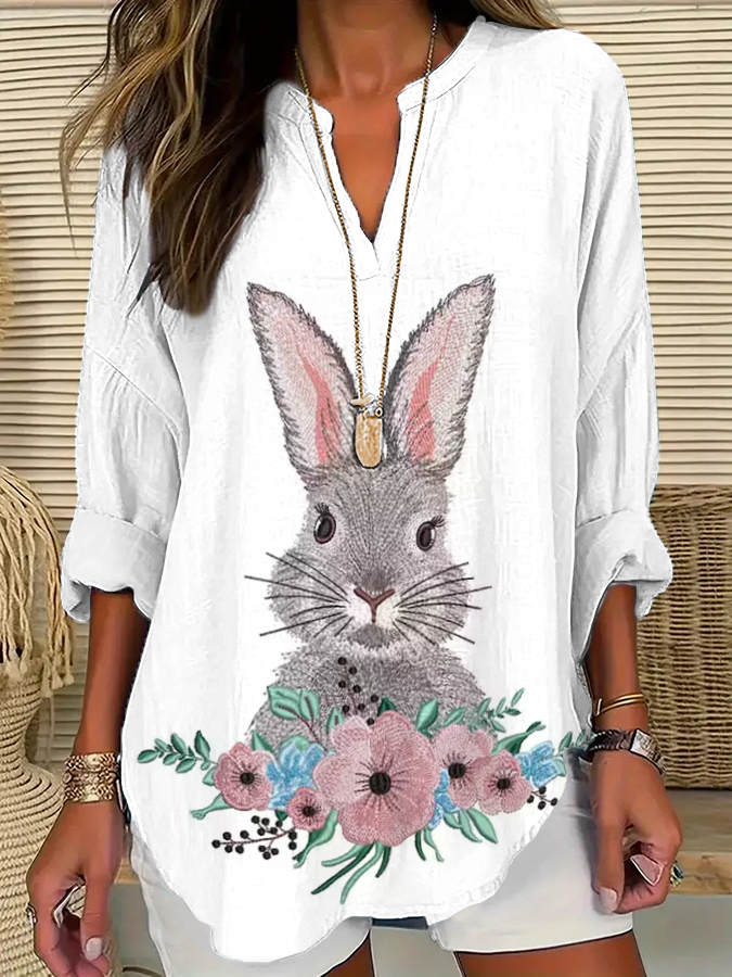 Women's Eatser Cute Bunny Pattern Printed V-Neck Long Sleeve Shirt