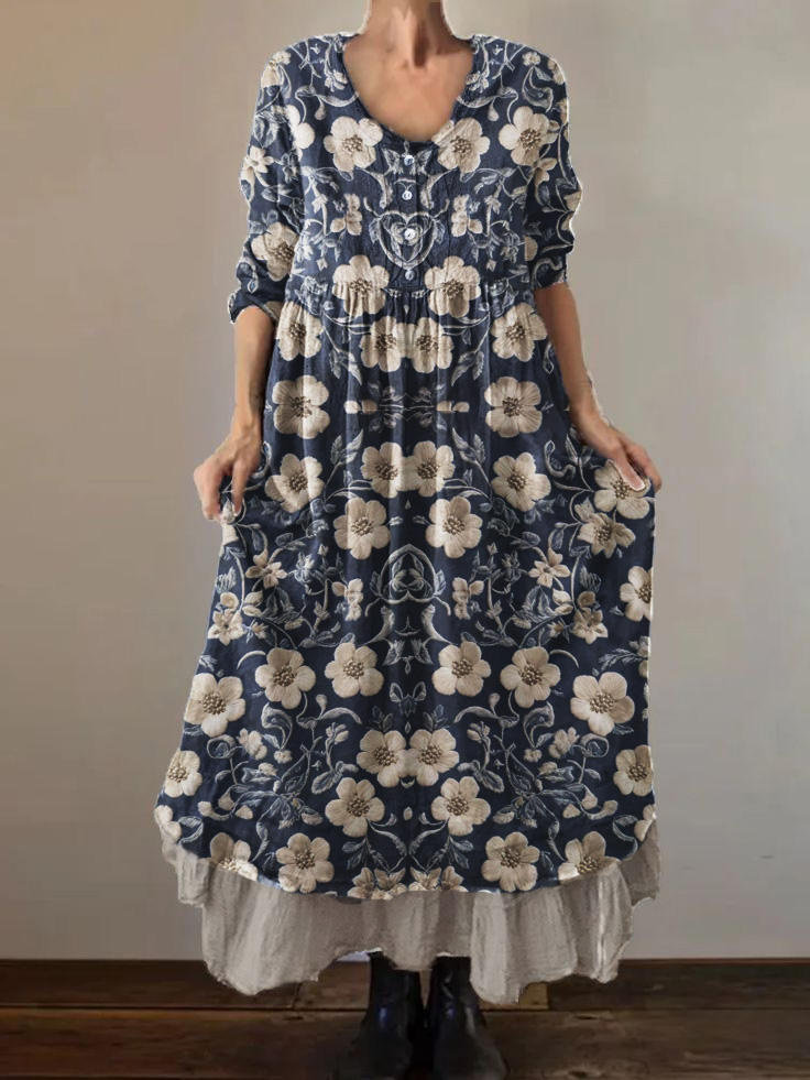 Women's Embroidered Floral Print Cotton and Linen Double Layer 3/4 Sleeve Dress