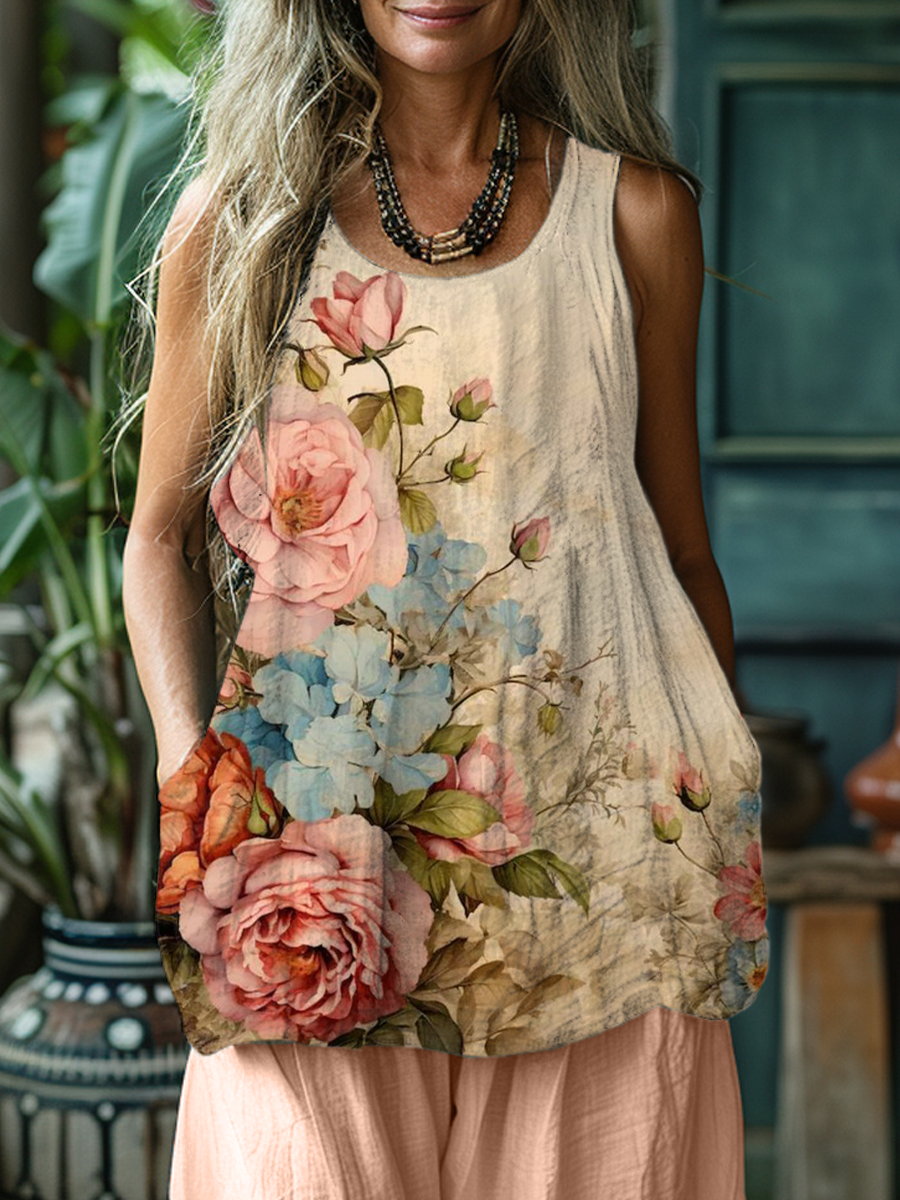 Women's Floral Art Print Linen Tank Top