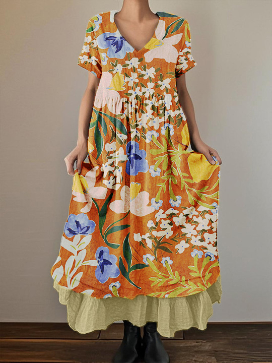 Women's Floral Art Print V-Neck Short Sleeve Cotton Linen Double Layer Dress