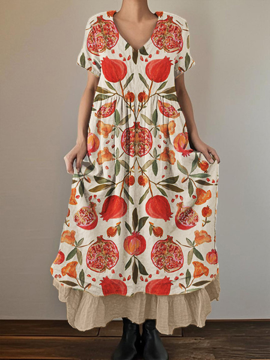 Women's Floral Art Print V-Neck Short Sleeve Cotton Linen Double Layer Dress