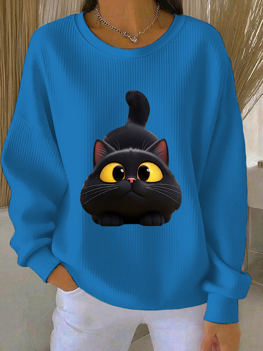Women's Funny Black Cat Ribbed Round-Neck Sweatshirt