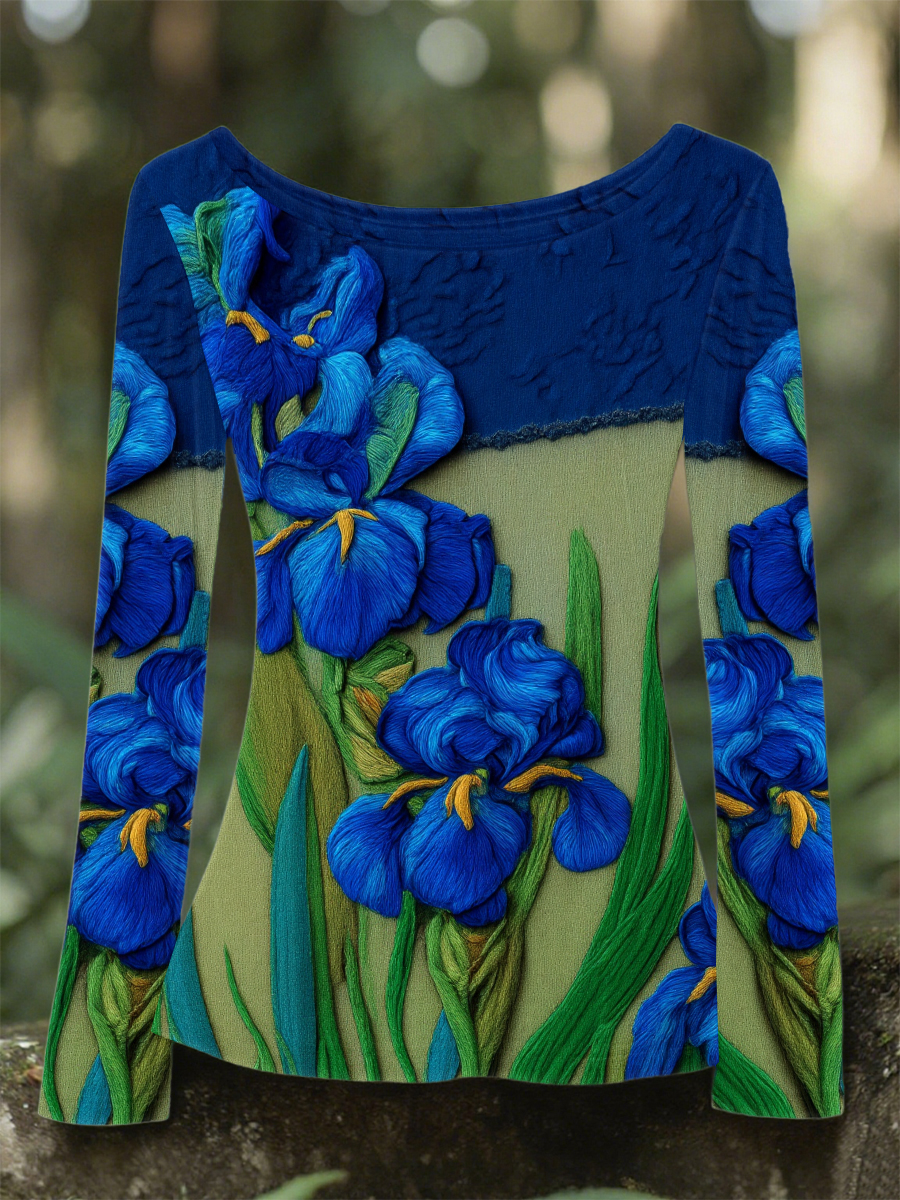 Women's Iris Embroidered Contrast Color Round Neck Long Sleeve Top