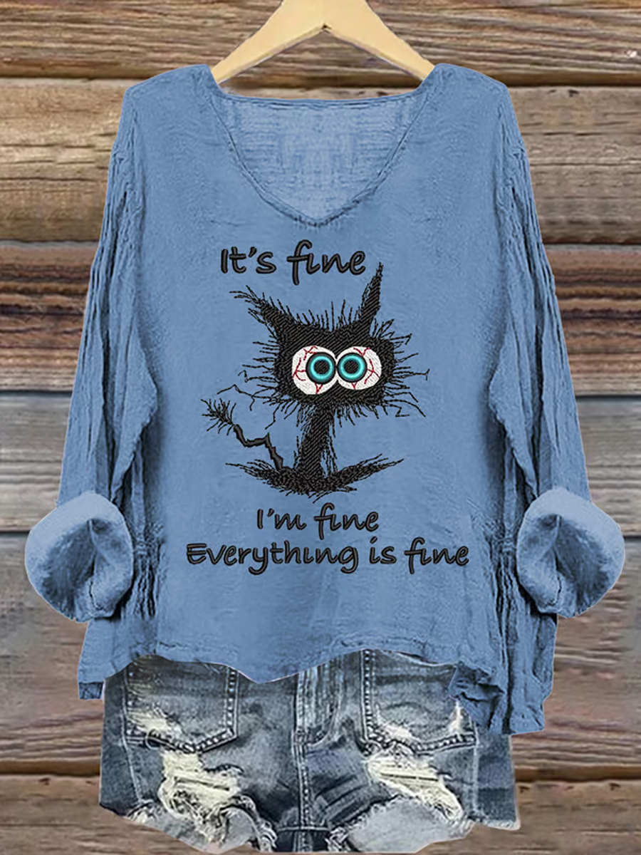 Women's It's Fine I'm Fine Everything is Fine Mental Health Awareness Printed Cotton Linen V-Neck Long Sleeve Shirt