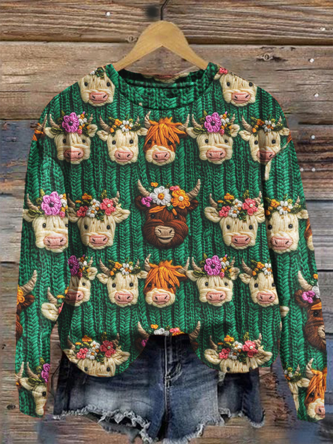 Women's Knitted Imitation Embroidery Seamless 3D Cute Highland Cow Pullover Sweater