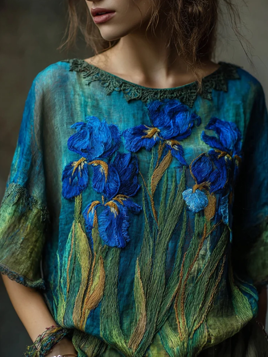 Women's Oil Painting Inspired Irises Embroidered Flowy Linen Casual Shirt