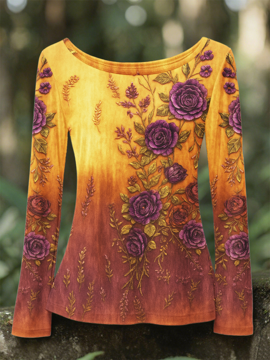 Women's Retro 3D Floral Embroidery Gradient Pattern Round Neck Long Sleeve T-shirt
