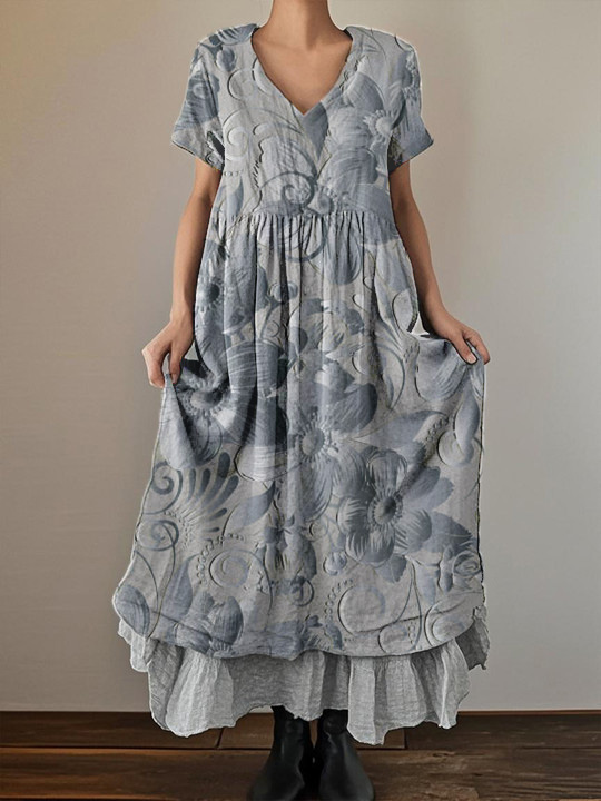 Women's Retro Stereoscopic Printed Short Sleeve V-Neck Double Layer Dresses