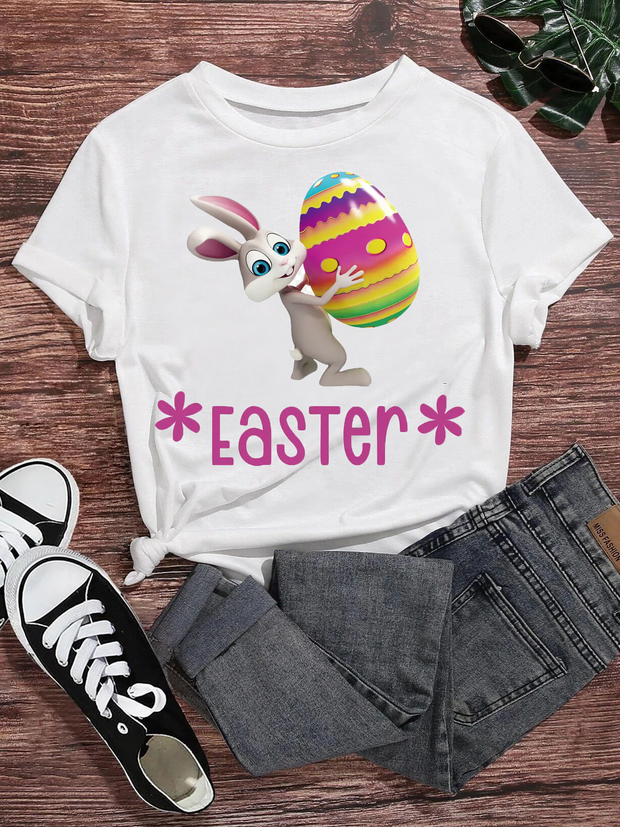 Women's Round Neck Rabbit Egg Print Short Sleeve T-Shirt