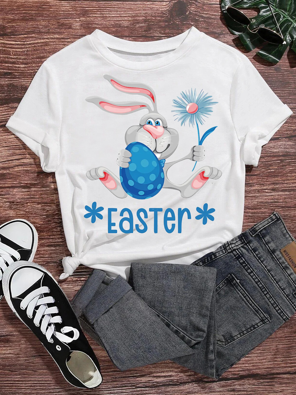Women's Round Neck Rabbit Egg Print Short Sleeve T-Shirt