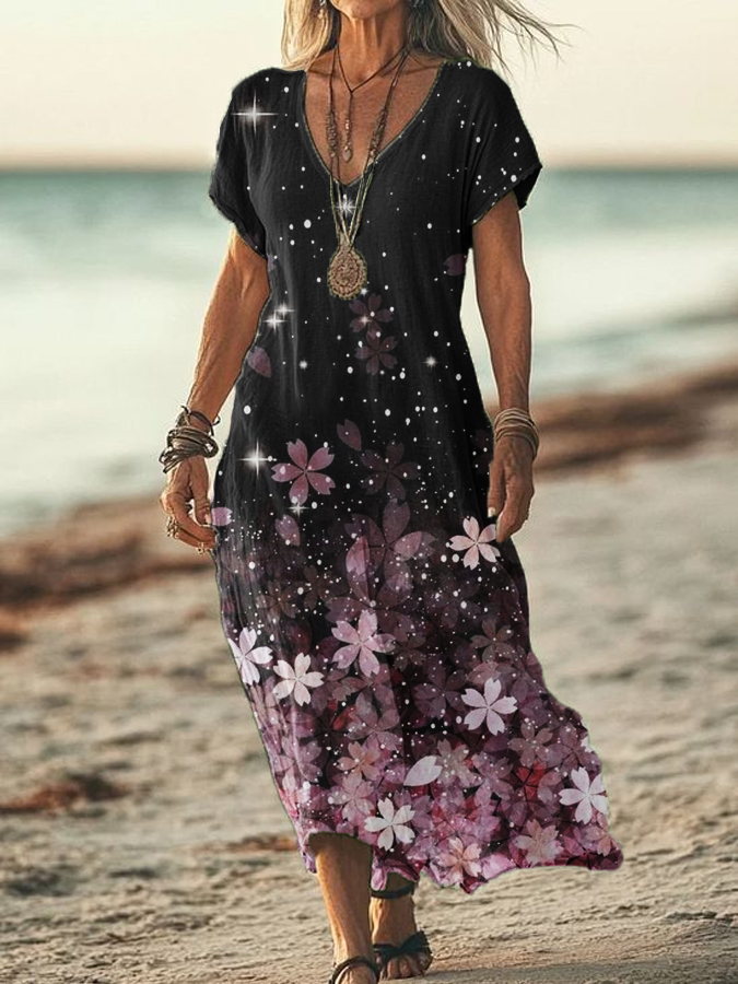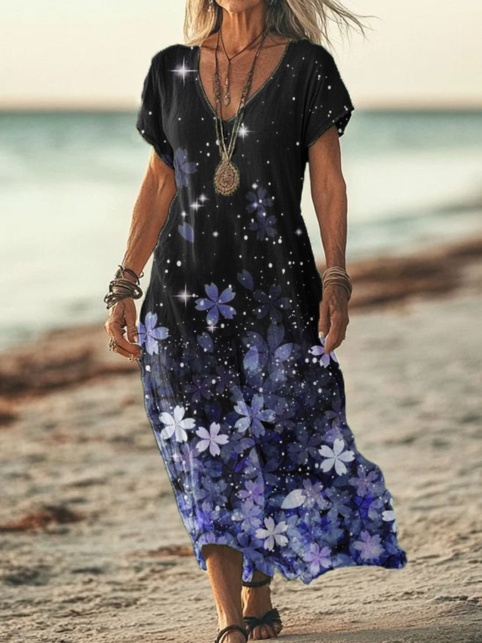 Women's Summer Seaside Vacation Style V-Neck Gradient Printed Short Sleeve Cotton Linen Dresses