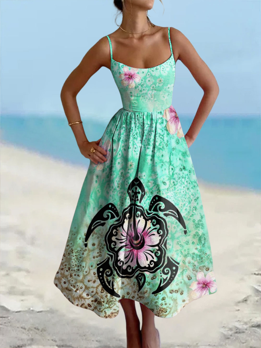 Women's Turtle Printed Printed Cotton Linen Camisole Maxi Dress