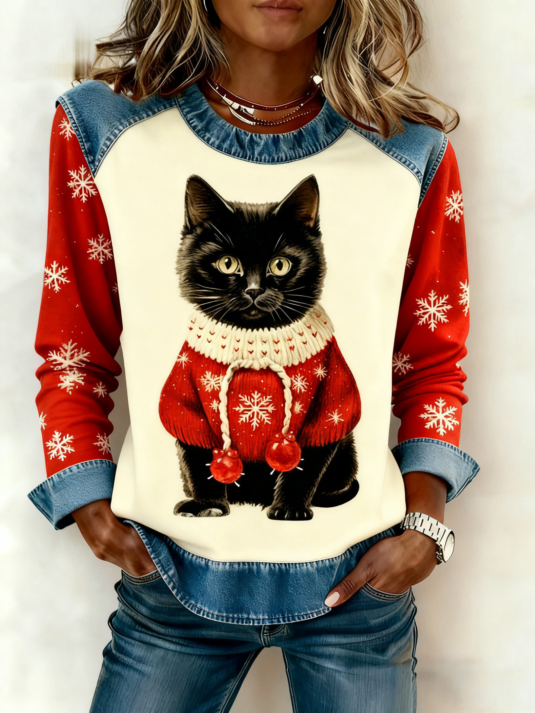 Women's Vintage Christmas Cat Denim Patchwork Sweatshirt
