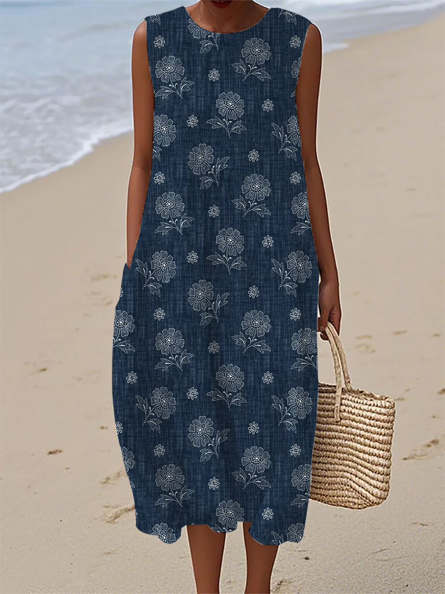 Women's Vintage Denim Patch Cotton Linen Casual Sleeveless Dress