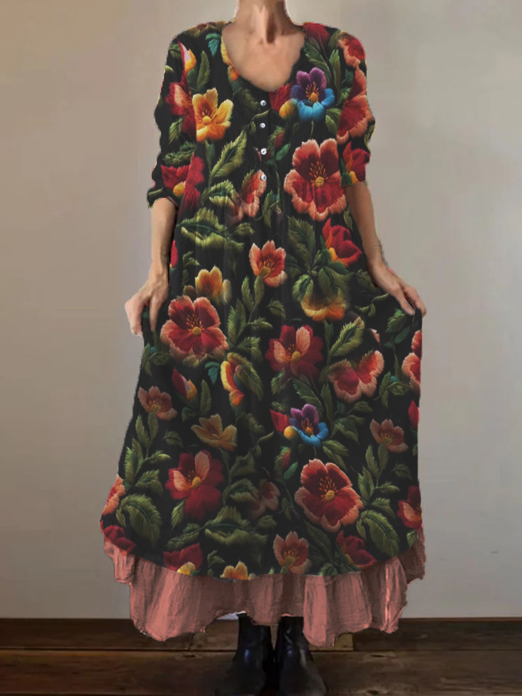 Women's Vintage Embroidered Floral Print Cotton and Linen Double Layer 3/4 Sleeve Dress
