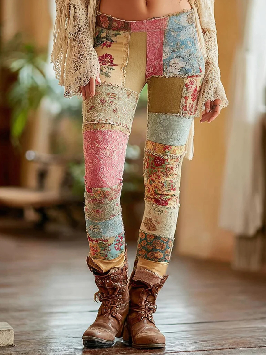 Women's Vintage Floral Patchwork Art Cozy Leggings