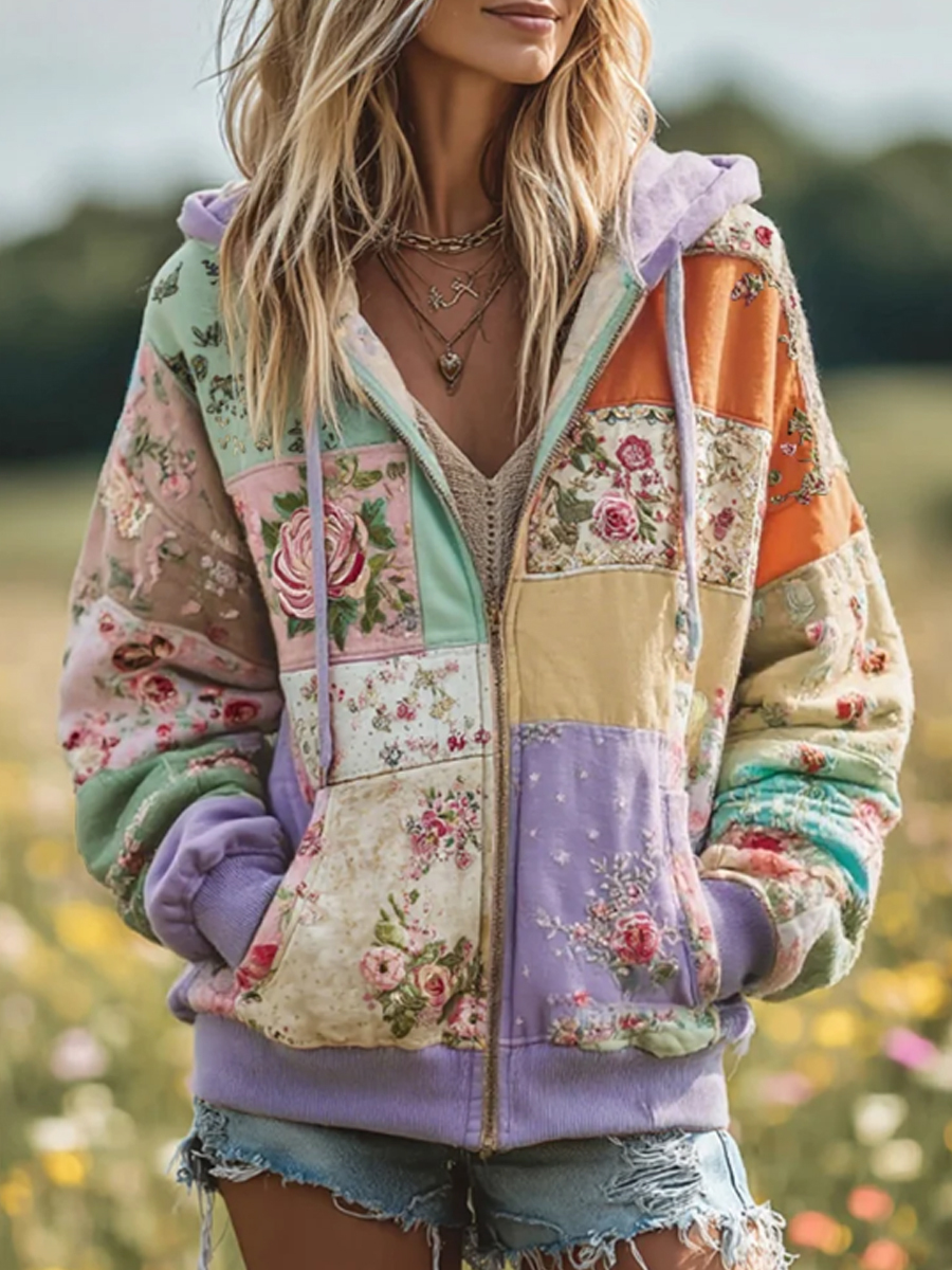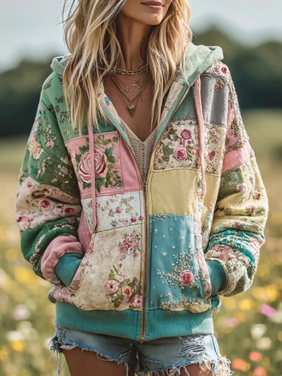Women's Vintage Floral Patchwork Cozy Warm Zipper Hoodie