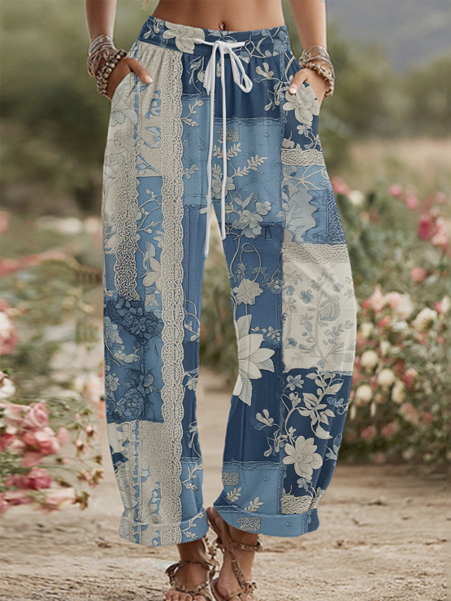 Women's Vintage Floral Patchwork Denim Cotton and Linen Pants