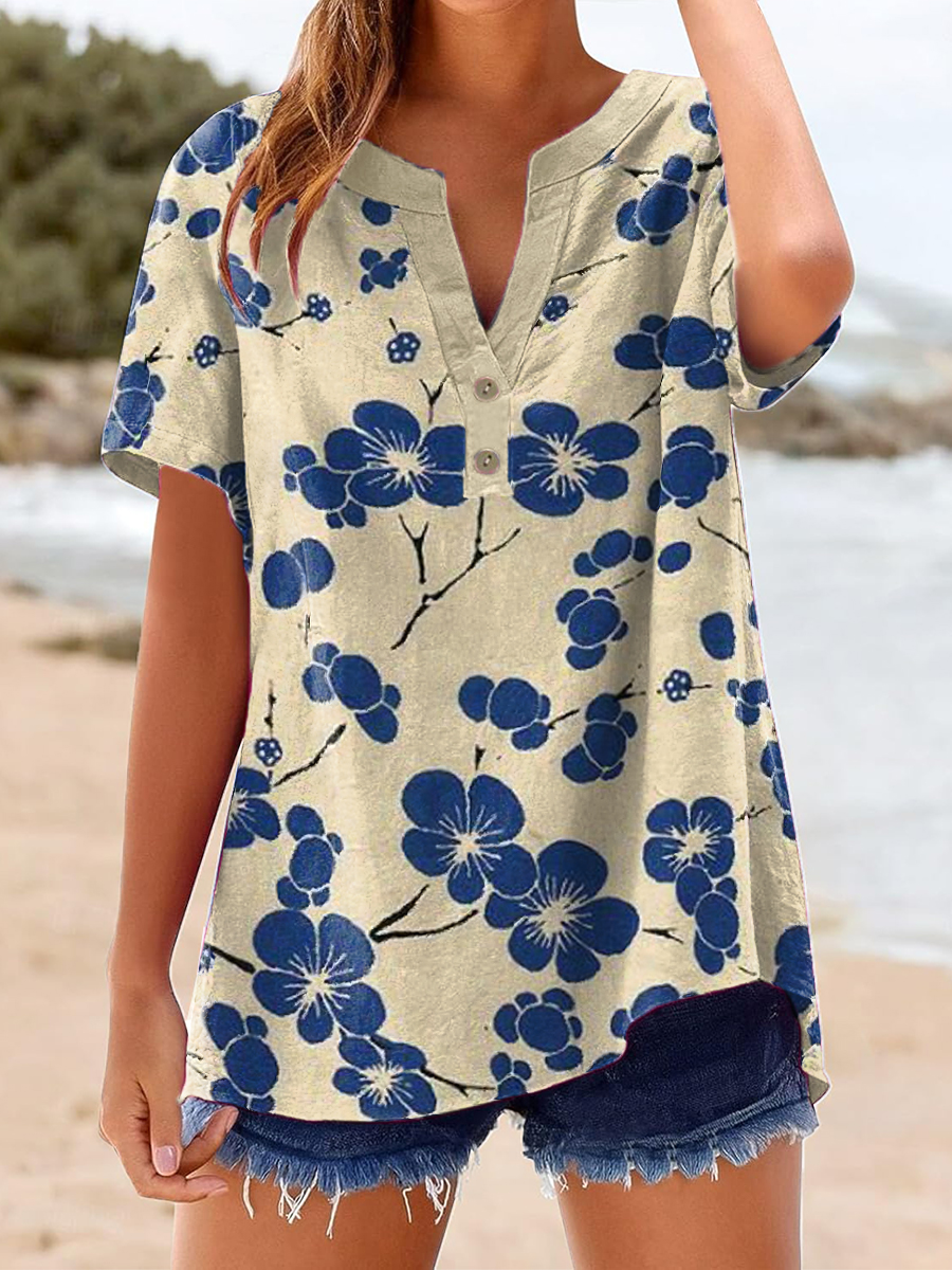 Women's Vintage Floral Print Linen Short Sleeve Shirt