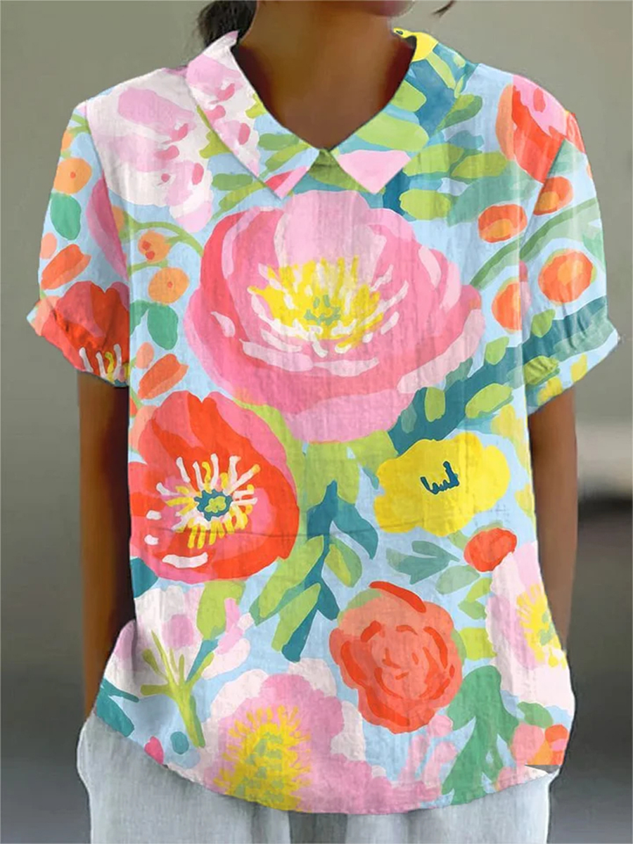 Women's Watercolor Floral Art Print Cotton Linen Short Sleeve Shirt