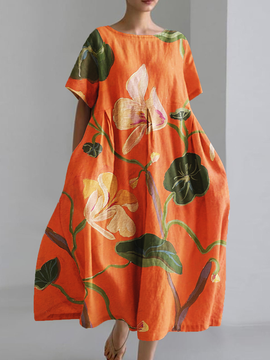 Women's Watercolor Floral Art Print Short Sleeve Pocket Dresses